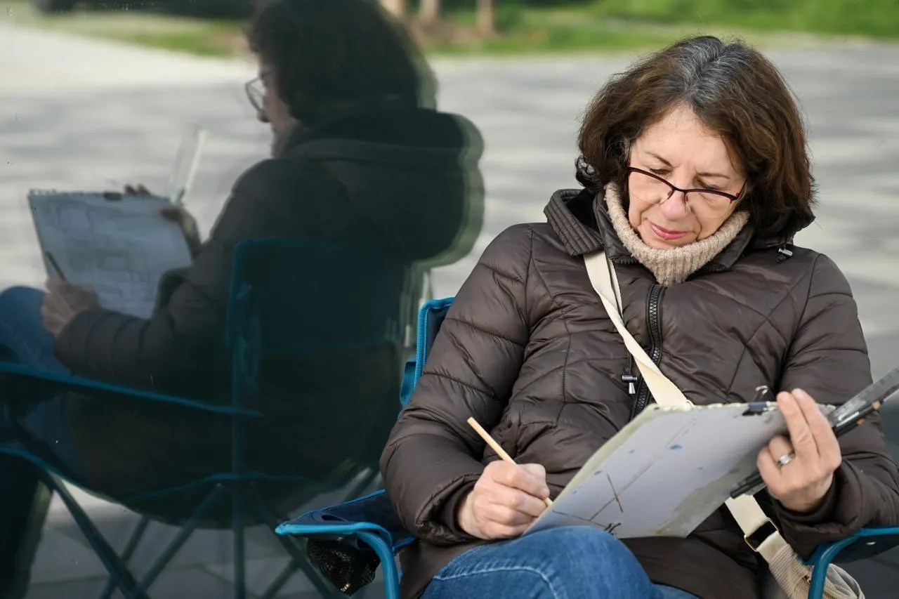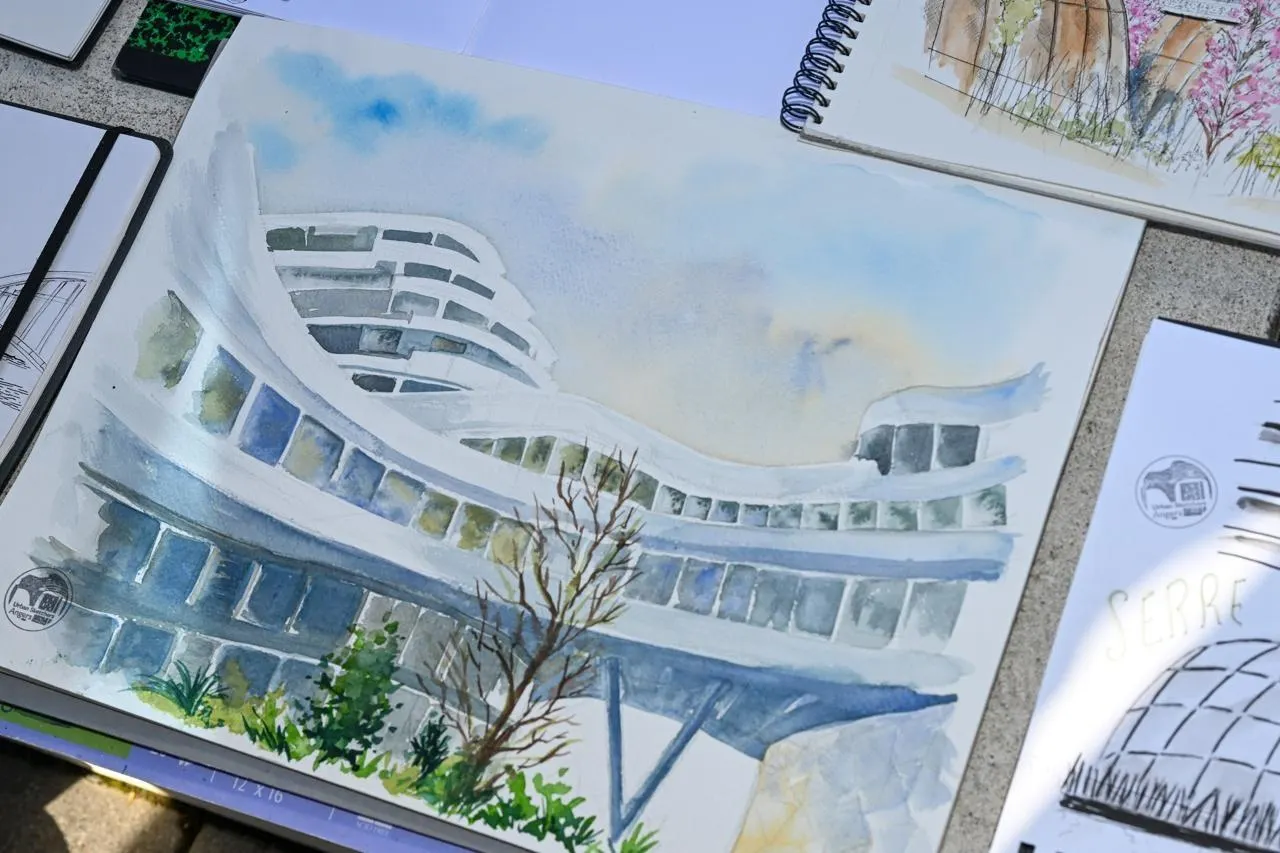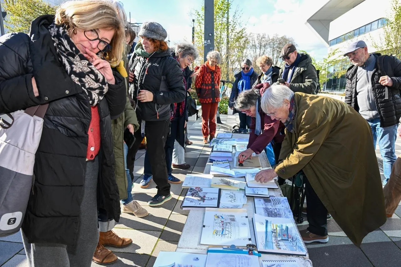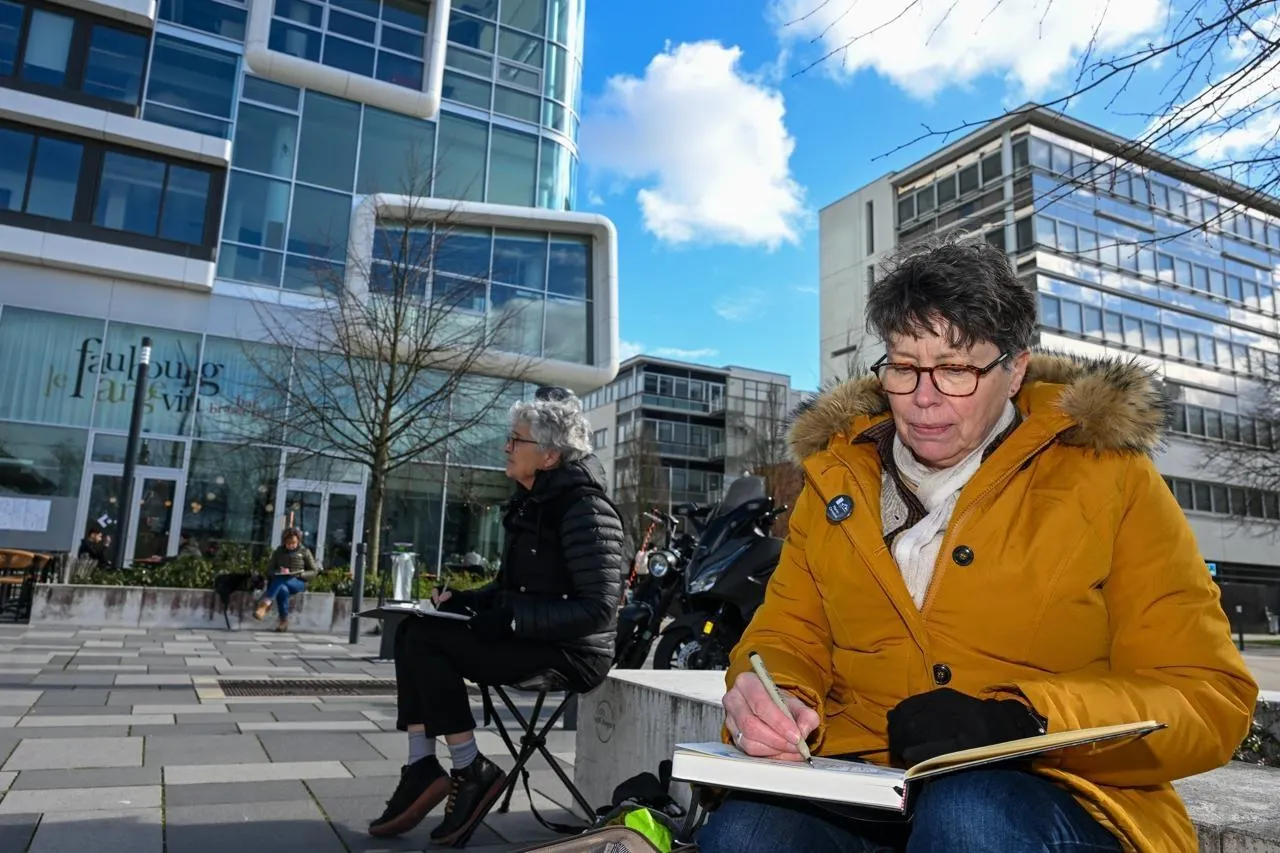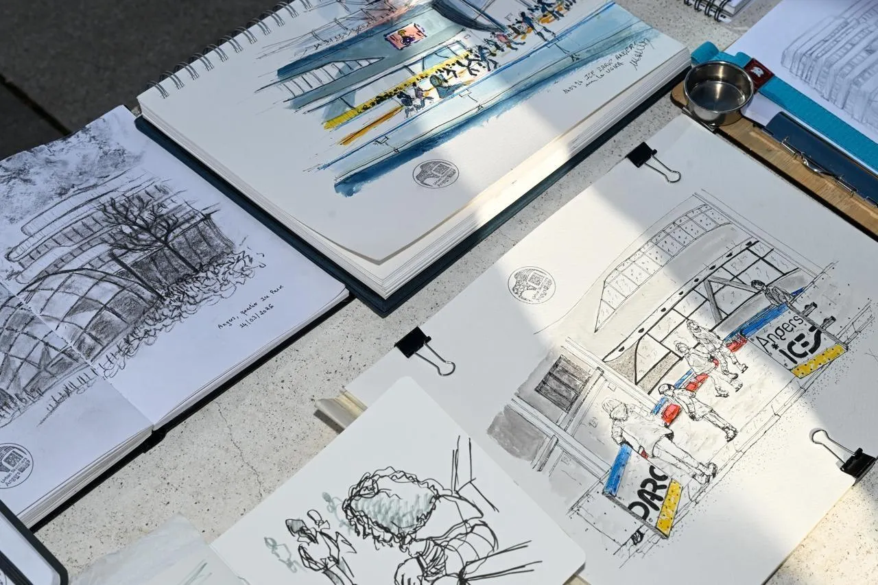 Angers, 14 mars 2026. Face à la patinoire ou aux immeubles tertiaires, les Urban Sketchers ont croqué des instantanés de vie dans le quartier. © CO – Laurent Combet