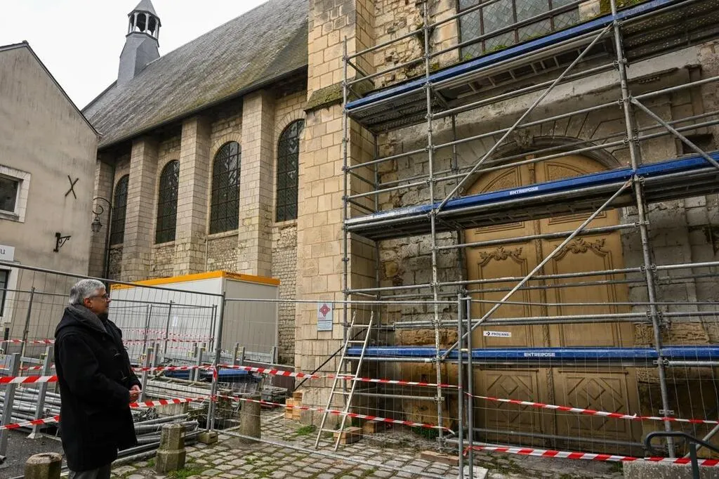 Angers, rue de la Censerie, 12 mars 2025. Les tailleurs de pierre vont avoir fort à faire, notamment pour redessiner le mur d’enceinte qui enferme la cour occidentale de l’église abbatiale. © LAURENT COMBET