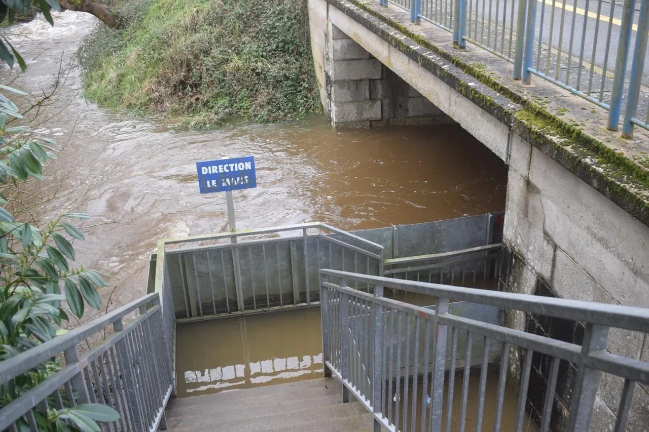 Le souterrain qui mène à la voie SNCF de la gare de Montsûrs, direction Le Mans, est inondé ce jeudi 12 février 2026. © Ouest-France