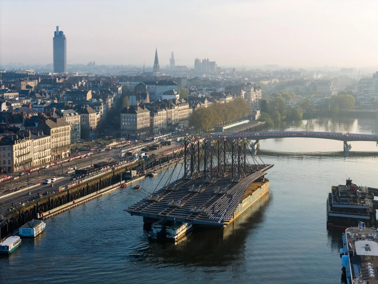 EN IMAGES. Vu du ciel, le tablier voguant vers le pont Anne-de-Bretagne, à Nantes, ce mardi matin... |