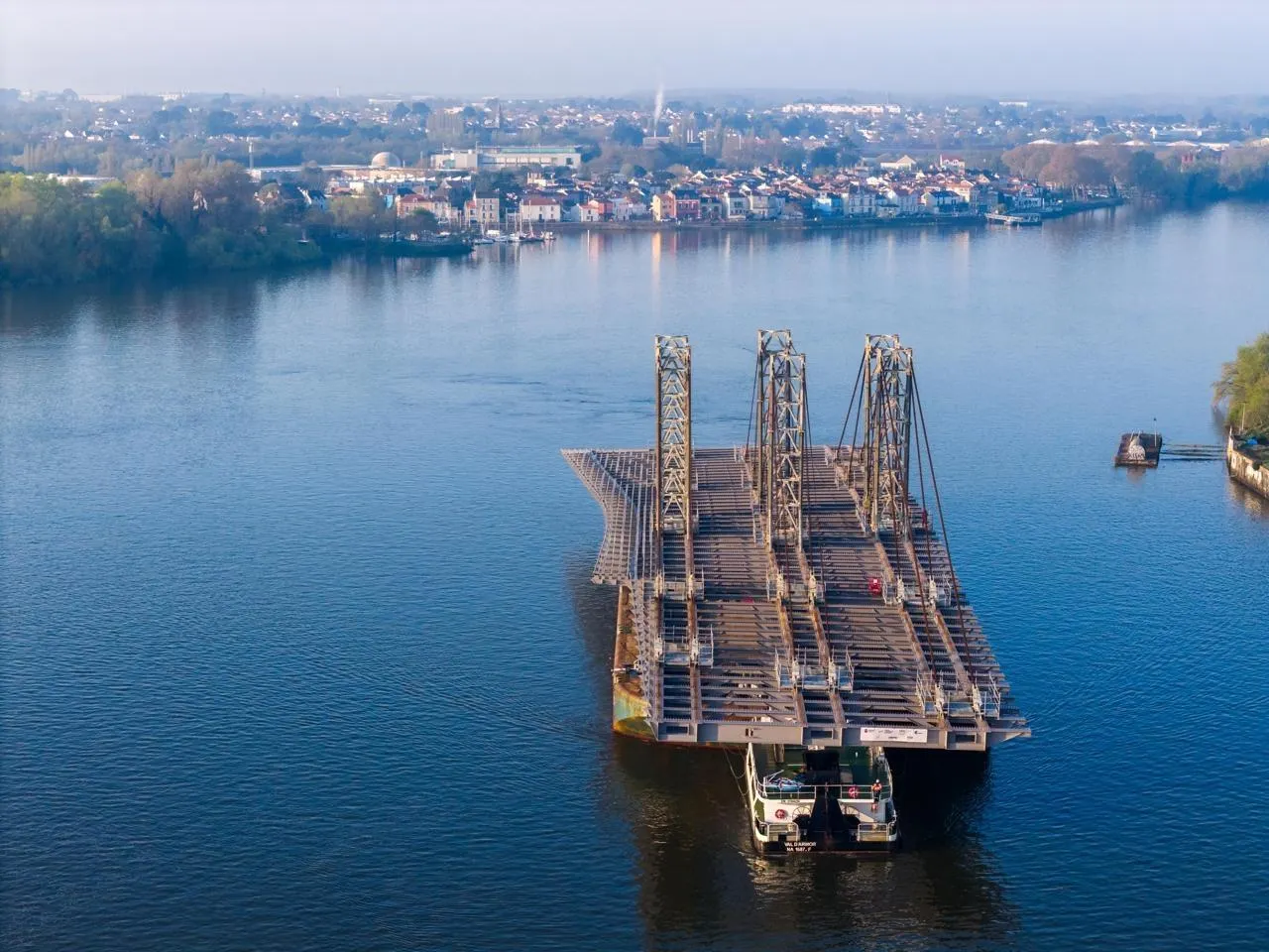 Ce mardi 24 mars, 8 h 09 : la barge qui transporte le tablier laisse derrière lui le quartier de Trentemoult, à Rezé, pour arriver dans le bras de la Madelaine. Franck Dubray / Ouest France