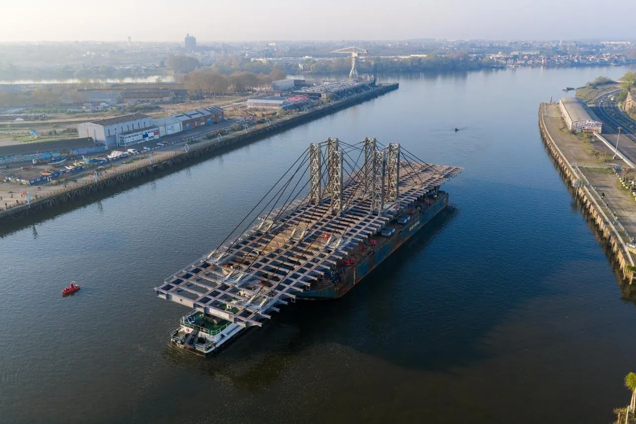 La fin d’un long et tumultueux périple pour ce tablier, une structure qui va être arrimée au pont, pour lui conférer le statut de pont le plus large d’Europe.