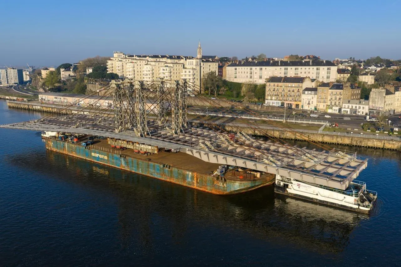 Le tablier charpente est arrivé à bon port un peu avant 8 h 30, ce mardi matin, 24 mars 2026. © Franck Dubray / Ouest France