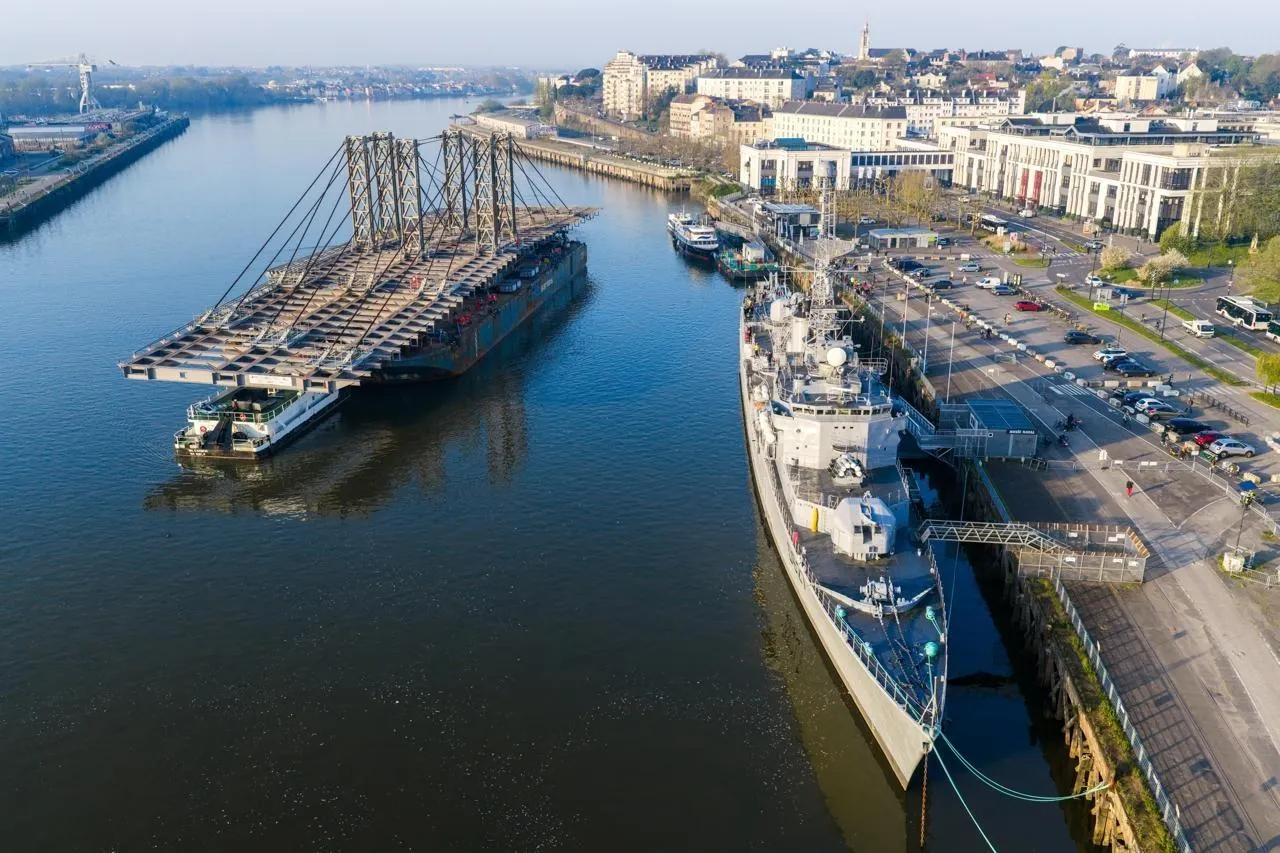 Il ne passe pas inaperçu, ce tablier. La structure de charpente qui va être arrimée au pont Anne-de-Bretagne, à Nantes, vient de rejoindre sa destination finale ce mardi matin, 24 mars, où il est arrivé à bon port un peu avant 8 h 30.