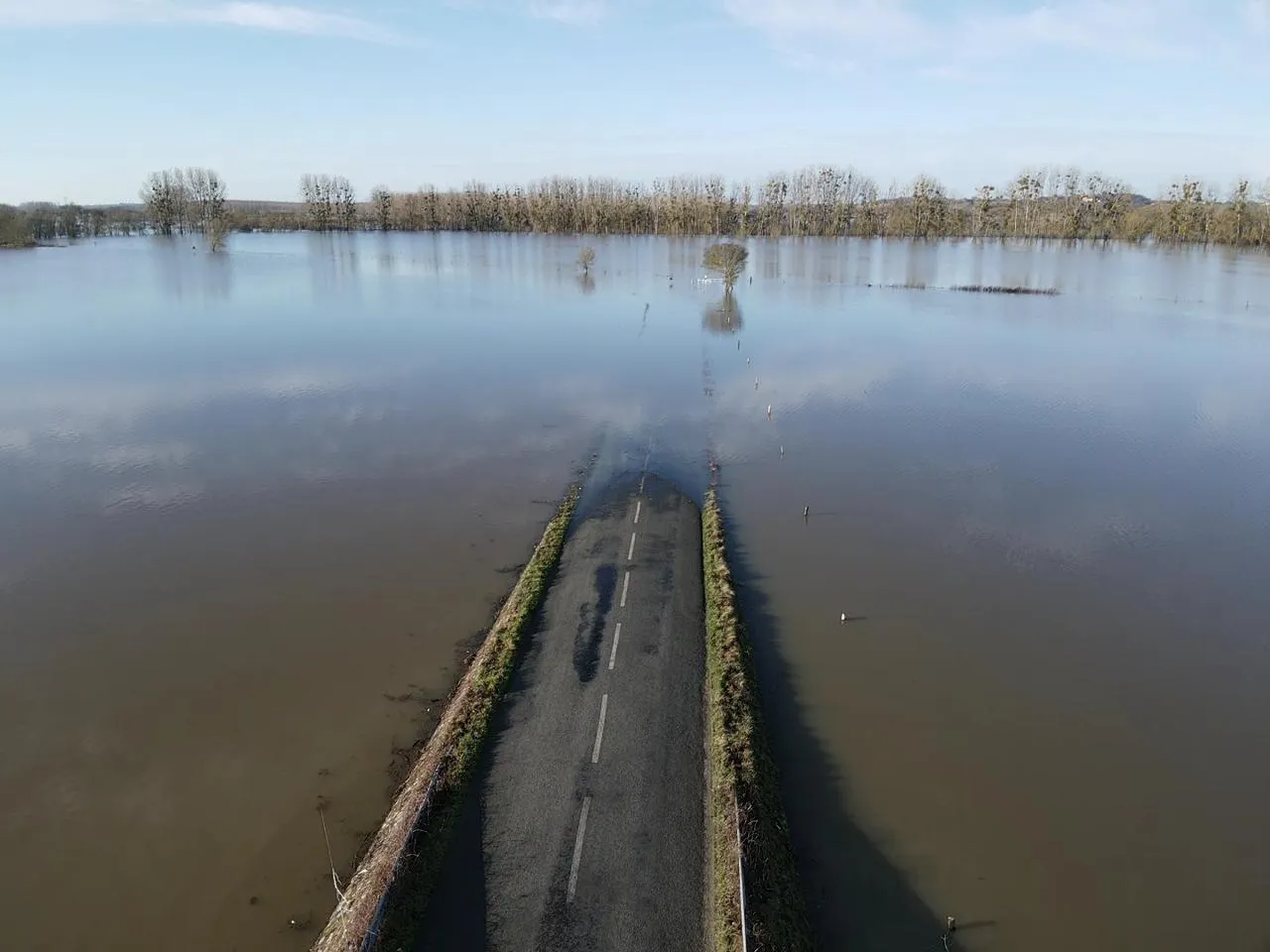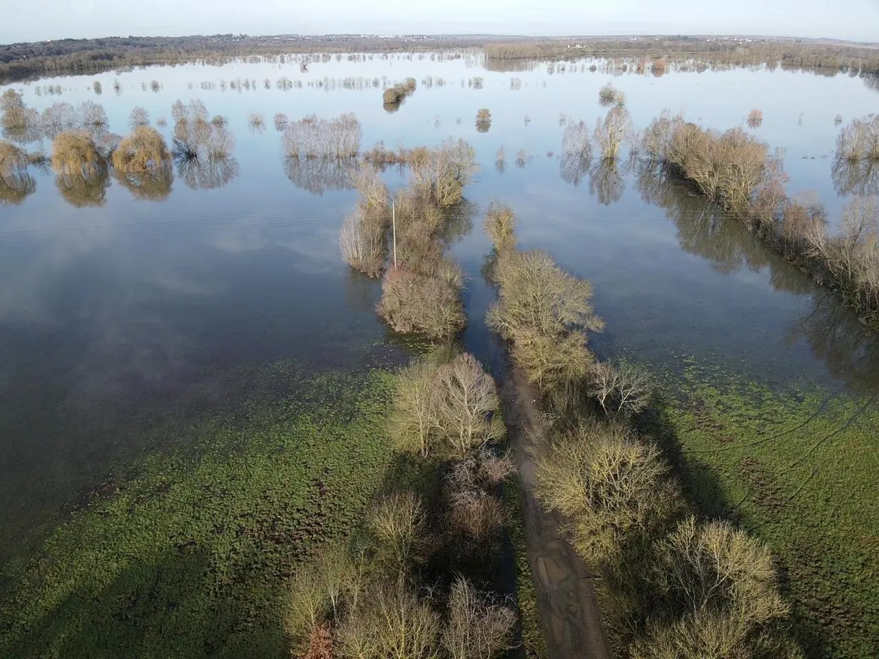 Comme ce paysage, capté par un appareil photo embarqué sur le drone de notre photographe, au-dessus de la départementale 109, à hauteur de la commune de Briollay. Ou, encore, dans le secteur d’Écouflant, ce chemin qui disparaît sous les eaux de la Sarthe en crue, comme sous des coups de pinceau célestes.