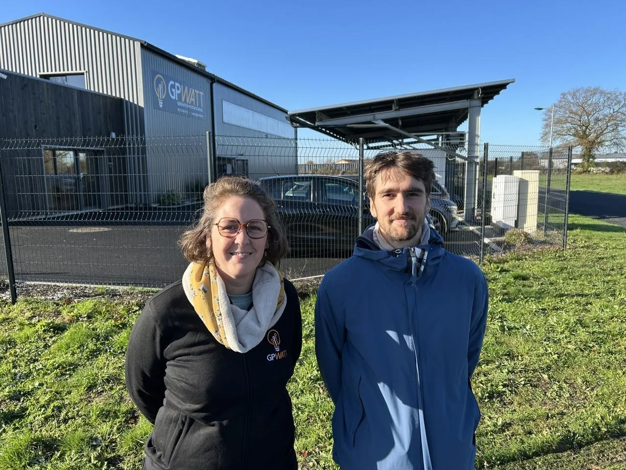 Melay (Chemillé-en-Anjou), vendredi 21 novembre 2025. Marion Leblanc (GPWatt) et Thomas Beziat (Atout Vent en Chemillois) devant les locaux de l’entreprise où est produite l’électricité renouvelable en jeu dans la boucle d’autoconsommation collective. © CO – Yves BOITEAU