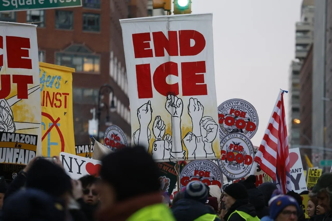 Une manifestation contre la police de l’immigration américaine (ICE) à New York, aux États-Unis, le 23 janvier 2026. © DECCIO SERRANO / NurPhoto via AFP