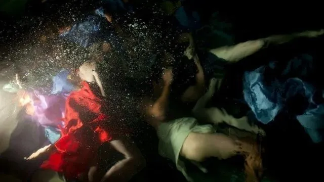 Photographiant dans l'eau, de nuit, sans autre trucage, Christy Lee Rogers fait naître d'étonnantes images, où les sujets se replient dans l'obscurité, se tordent, se confondent, se dissolvent même dans l'abstraction. Ses drapés tourmentés, ses couleurs vives, suspendus dans les eaux, font penser à des toiles de maître.