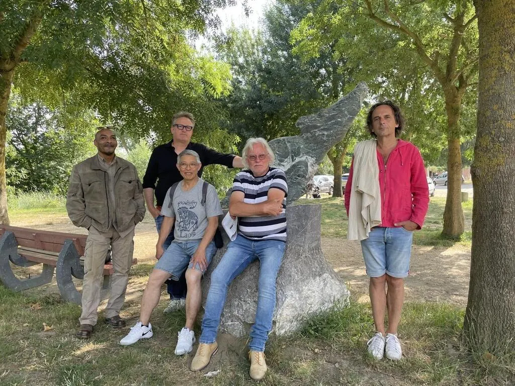 Les sculpteurs Moïse Marthely, Christophe Batardière, Thong Lith et Jean-Claude Lambert, avec le réalisateur Thierry Charrier, devant la sculpture de la “Souris verte” de Bertrand Donnot, à Montjean-sur-Loire. © Ouest-France