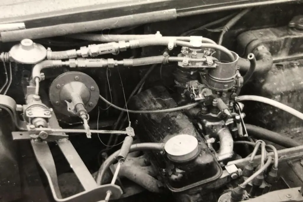Villevêque, janvier 1979. Jean-Luc Perrier présente chez lui, dans son jardin, sa vieille Simca 1000 à hydrogène. © Archives Le Courrier de l’Ouest