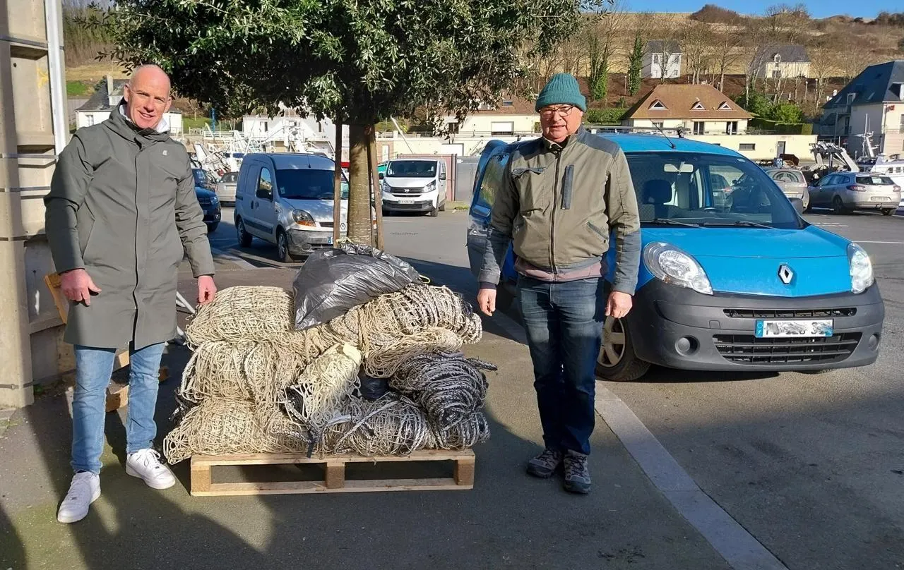 Le patron de pêche Jérôme Vicquelin (à gauche) apporte son aide à Jacques Peigney pour décharger des palettes contenant les filets de protection et de sécurité de la société bayeusaine Hydéal. © Photo : Ouest-France