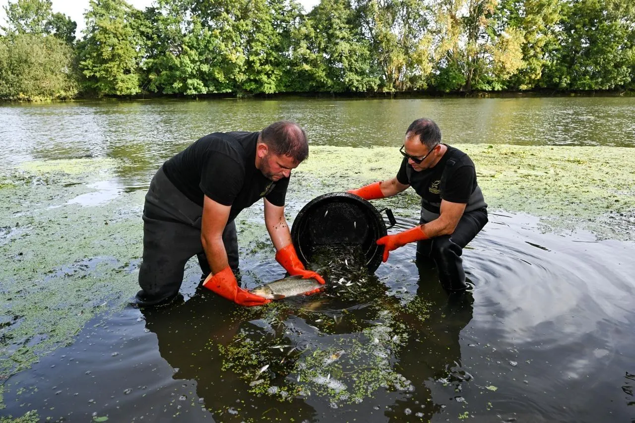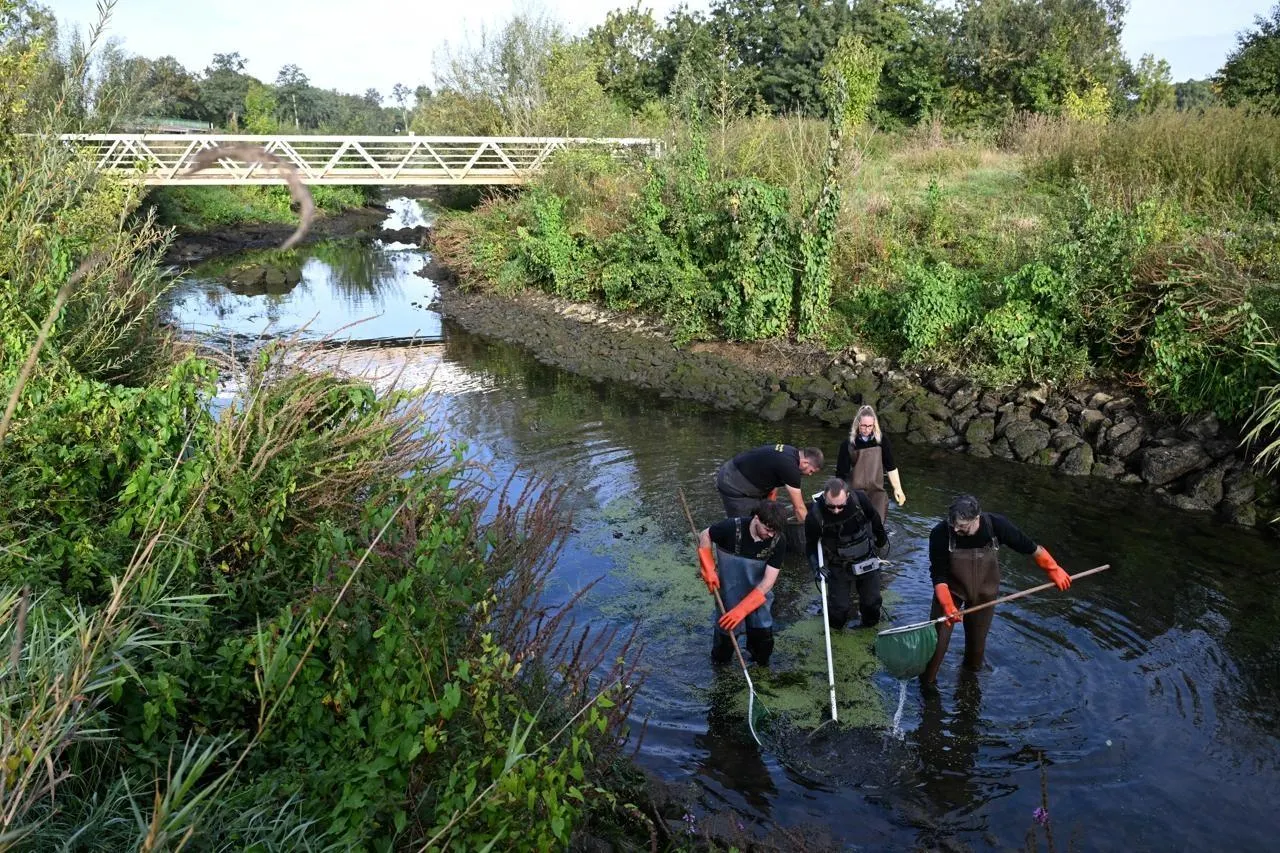 Cheffes, le 16 septembre 2025. La fédération de Maine-et-Loire pour la pêche et la protection du milieu aquatique organise des pêches de sauvegarde dans le cadre des écourues sur la Sarthe. Des pêches de sauvegarde qui permettent de préserver des milliers de poissons. © CO - Josselin Clair