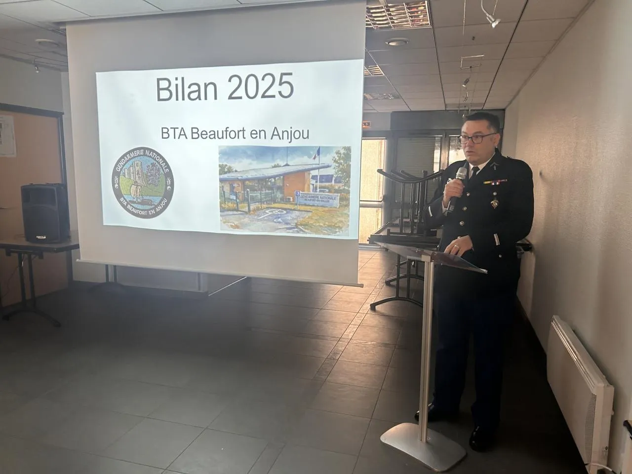 La Ménitré, le 20 janvier 2026. Le major Bruno Moulin, commandant de la brigade autonome de gendarmerie de Beaufort-en-Anjou, a présenté le bilan de la sécurité publique de l’année 2025 dans les communes de l’Entente-Vallée. © CO – Christophe Ricci