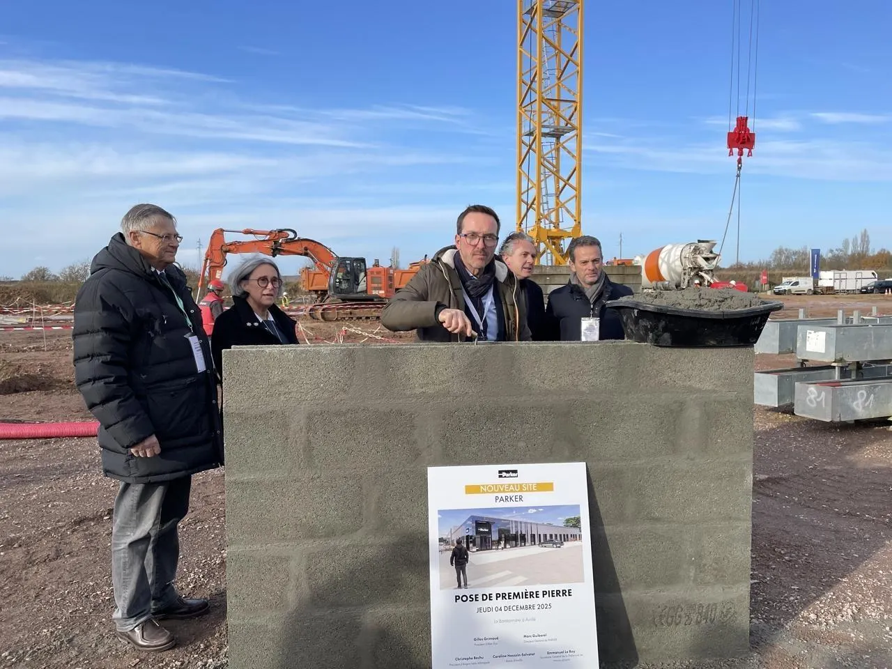 Marc Guiborel, directeur général de la branche Meggitt, pose la première pierre de la future usine du groupe, en présence du directeur groupe Parker, de la maire d’Avrillé, du président d’Angers Loire Métropole et du président d’Alter Eco. © CO