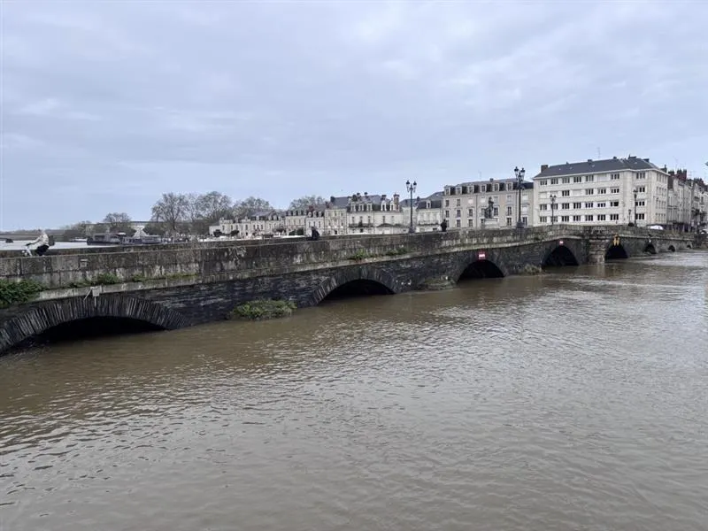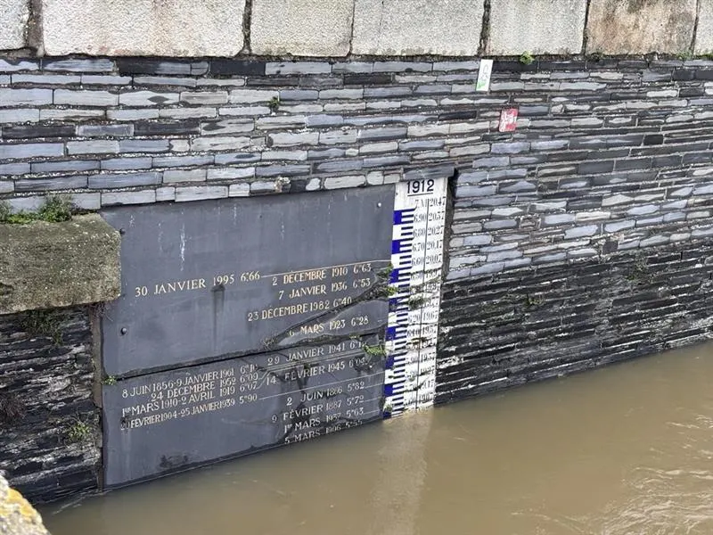 La Maine a dépassé ce week-end les 5 mètres de haut (5,37 m dimanche) à Angers et contine ce lundi de monter de 1 cm par heure. Elle était à 5,55 m ce lundi à 8 h 45 au pont de Verdun. Elle doit y atteindre les 5,85 m ce lundi soir ou mardi matin. Non loin des 6,12 m en 2000. Mais encore à 1 m du record historique du 30 janvier 1995 (6,66 m).