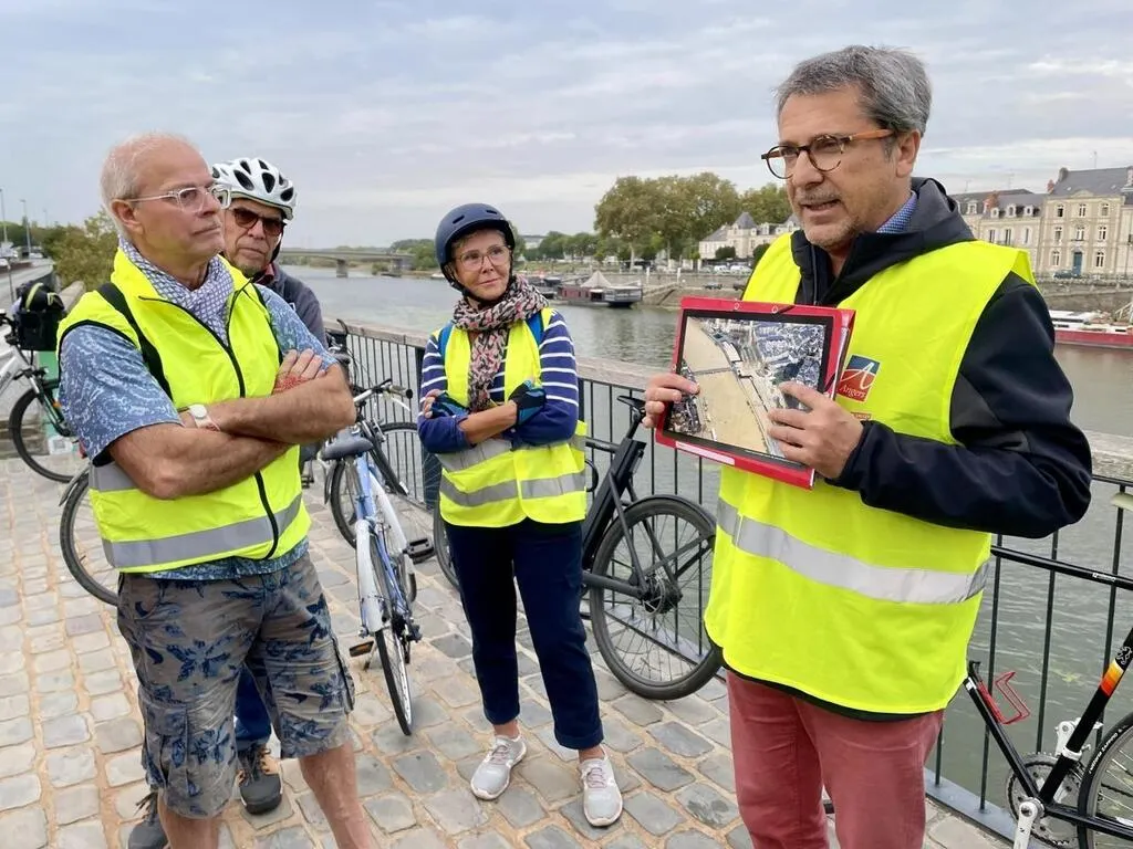 Angers, Quai Ligny, 13 octobre 2023. Le niveau de la Maine est à peine au-dessus de l’étiage. En 1995, elle était montée à 6,66 mètres a rappelé Marc Fleury, responsable du service prévention des risques de la Ville d’Angers lors d’une déambulation sur le thème des crues. © CO – Anthony PASCO
