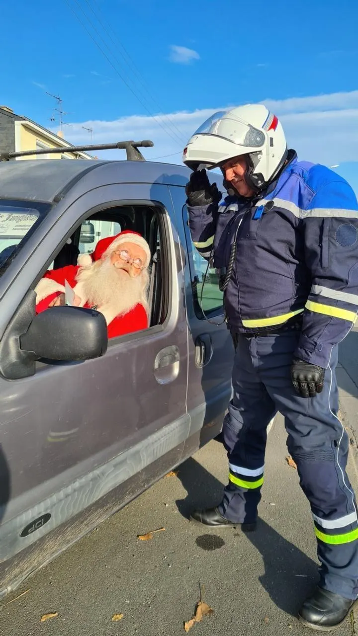 Le père Noël et Yannick, le policier, ont fait connaissance sur le bord de la route lors d’un contrôle d’identité pas si banal. © DR