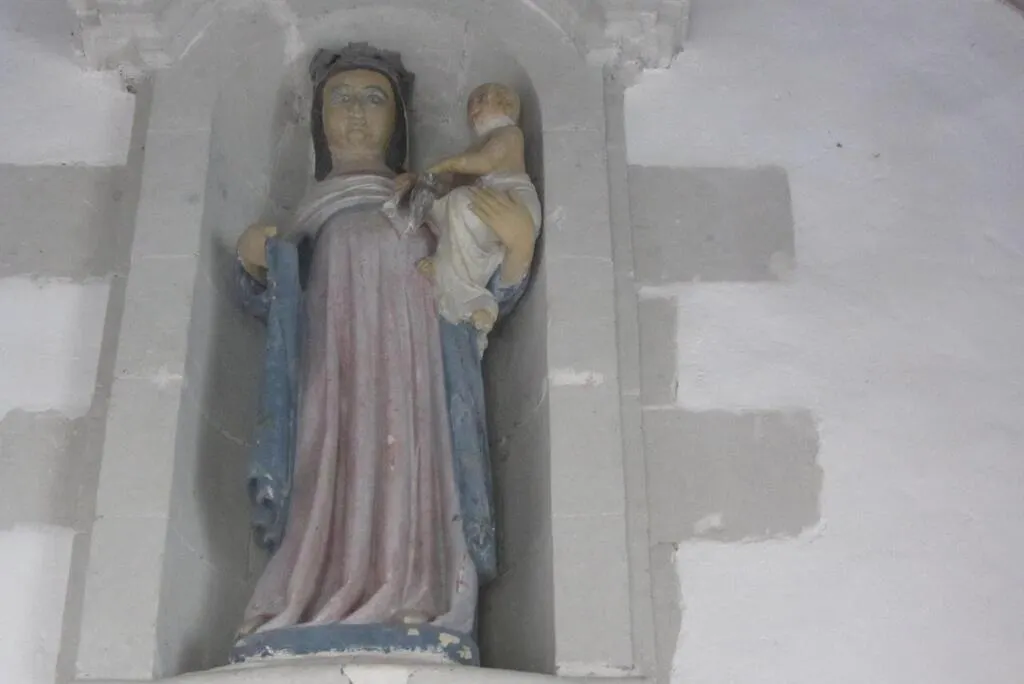 La chapelle abrite les deux Vierges à l’Enfant, celle-ci étant en pierre peinte de 1,25 m de haut d’art populaire selon l’expression de Henri Enguehard, architecte départemental. Elle est vêtue d’une longue robe dont les plis épais descendent aux pieds. Ouest-France