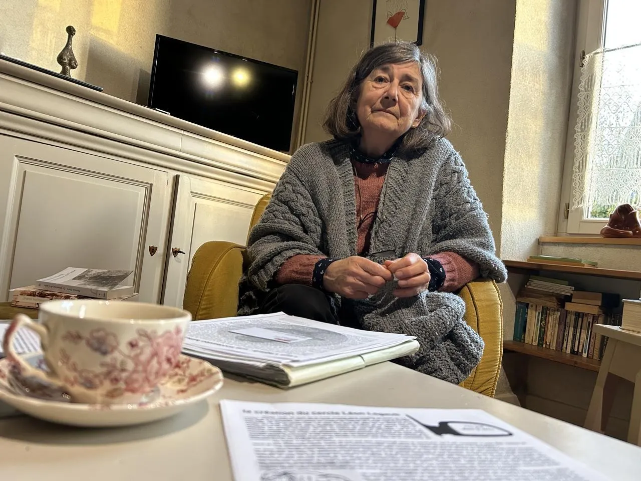 Patricia Touzé devant la statue de Léon Legault édifiée à proximité de la mairie suite à son legs. © CO - Laurent COMBET