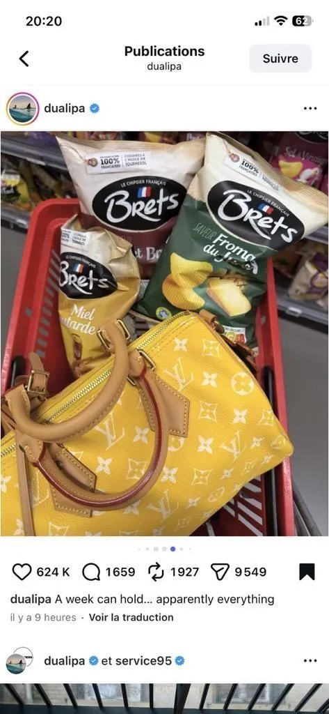 La vie de star… La chanteuse britannique Dua Lipa a posté une photo de ses courses sur son compte Instagram, ce lundi 9 février 2026. Sur le cliché, le panier de la star contient trois paquets de chips fabriquées en Bretagne.