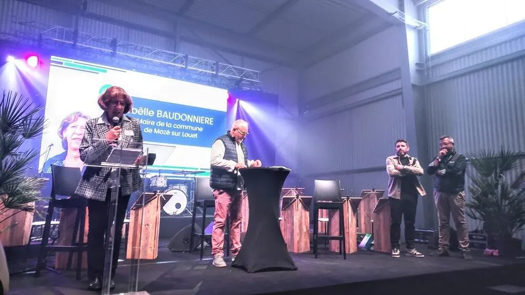 Joëlle Baudonnière, maire de la commune de Mozé-sur-Louet, lors de son allocution dans le nouveau bâtiment de 1 800 m2, en présence de Stéphane Mansard, président (à droite) ; Fabien Brochet, directeur général ; et de Sébastien Roy, un adhérent animateur de la cérémonie. © Ouest-France