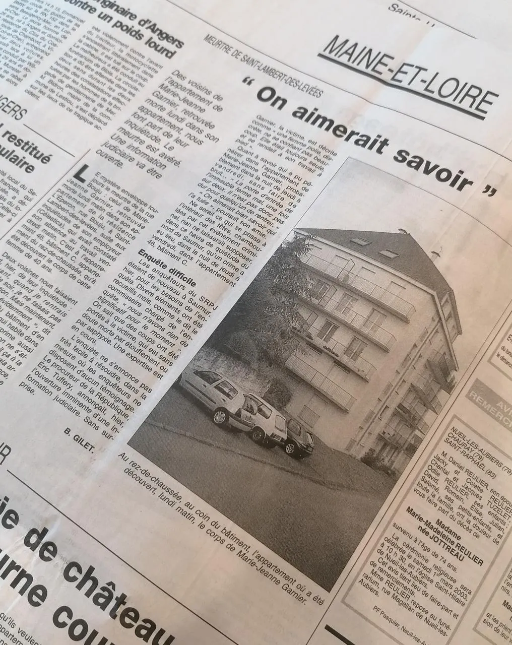 Le 24 février 2003, Marie-Jeanne Garnier, 41 ans, est retrouvée morte dans sa chambre, à Saint-Lambert-des-Levées (Maine-et-Loire), en bord de Loire. L’auteur du meurtre, un jeune homme de 20 ans, a été dénoncé par sa mère après qu’un sac appartenant à la victime a été retrouvé dans le voisinage.