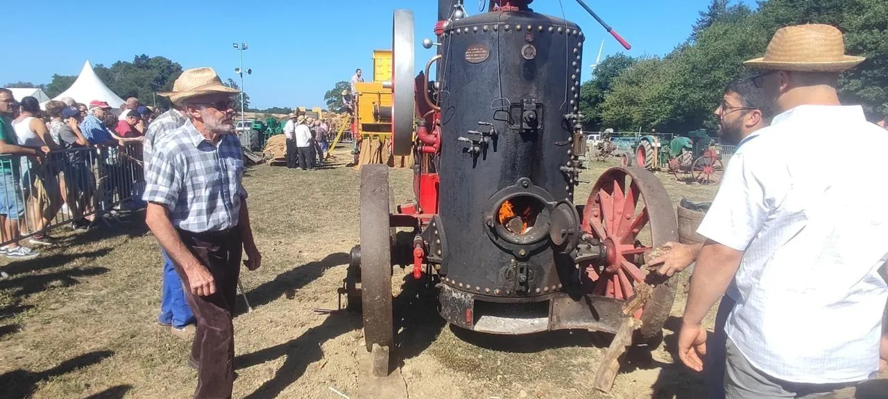 Sur l’aire de battage, la locomotive à vapeur a retrouvé toute sa vigueur, entraînant la batteuse qui sépare le grain de la paille. Une équipe de jeunes s’est relayée pour alimenter la machine, tandis que les visiteurs découvraient une exposition de tracteurs et de moteurs, ou observaient la fabrication du cidre à l’ancienne et des rillauds fumants, prêts à emporter.