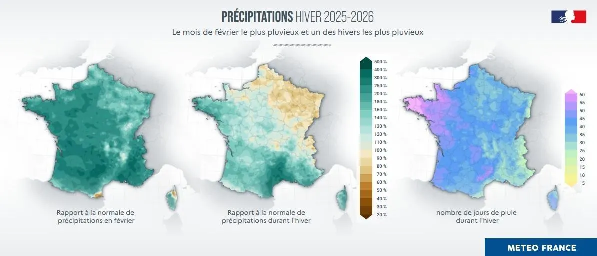 Le mois de février a été le plus pluvieux jamais enregistré depuis 1959, devant février 1970, explique Météo France. Entre le 7 et le 19 février 2026, le pays a été soumis à des pluies quasi quotidiennes sur des sols souvent déjà saturés.