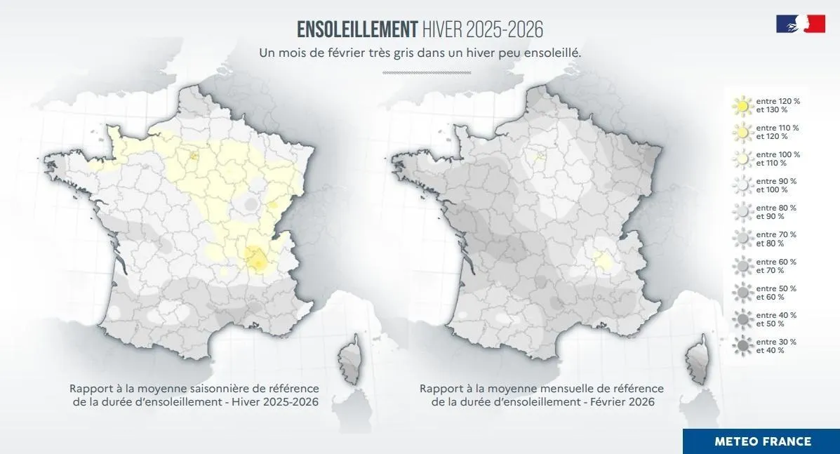 L’ensoleillement de l’hiver 2025-2026 a été déficitaire sur une grande partie de la France. METEO FRANCE