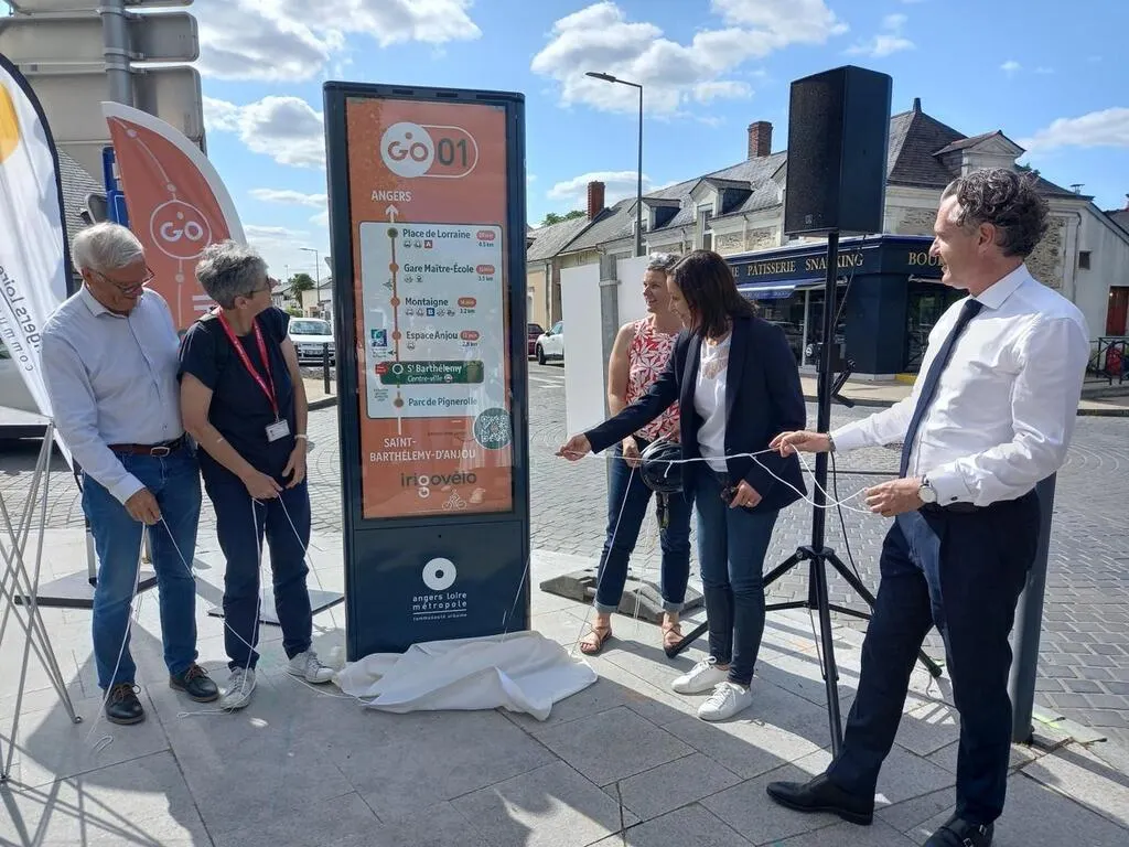 Lundi 2 juin, Dominique Bréjeon, maire de Saint-Barthélemy ; Corinne Bouchoux, vice-présidente d’Angers Loire Métropole en charge de la mobilité ; Patricia Kervarec, directrice de la voirie à ALM ; Florence Dabin, présidente du conseil départemental ; et Christophe Béchu, président d’ALM, ont dévoilé le totem d’Irigovélo, au centre de Saint-Barthélemy. © Ouest-France
