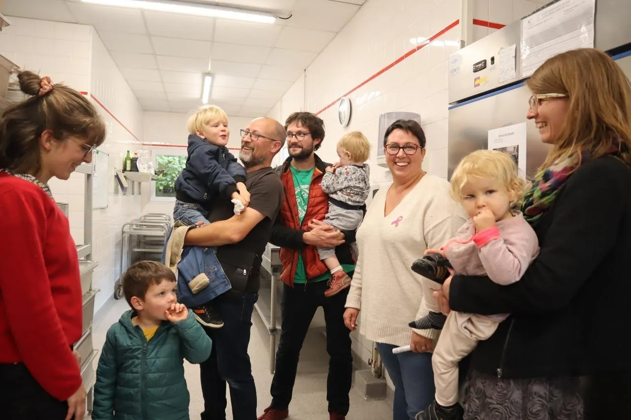 Les très jeunes bénéficiaires des repas préparés par la cuisine centrale ont découvert les lieux avec leurs parents, sous la conduite pédagogique de Laura Martin, aide cuisinière. 650 repas sont servis par jour aux trois écoles, à la crèche, au centre de loisirs des Goulidons, aux résidants de Soleil de Loire le midi (40 repas en moyenne) et chez une trentaine de personnes (portage à domicile). © CO