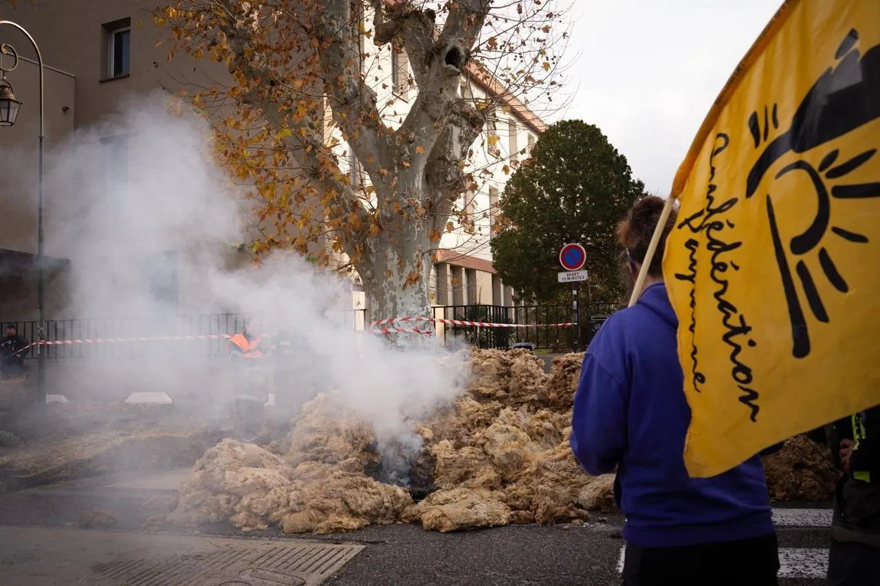 Dans l’Aude, la confédération paysanne et le syndicat des éleveurs sont mobilisés devant la direction départementale de l’emploi, du travail, des solidarités et de la protection des populations (DDETSPP) face à la stratégie sanitaire employée contre la dermatose nodulaire contagieuse (DNC) des bovins. Ils se positionnent contre l’abattage total systématique. © Hans Lucas via AFP