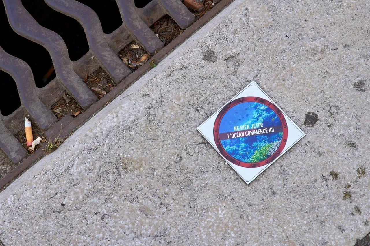 Aux Sables d Olonne, un mégot vient d’être jeté devant une plaque d’égout, un logo avec l’inscription : « Ne rien jeter, l’océan commence ici ». © Hans Lucas via AFP