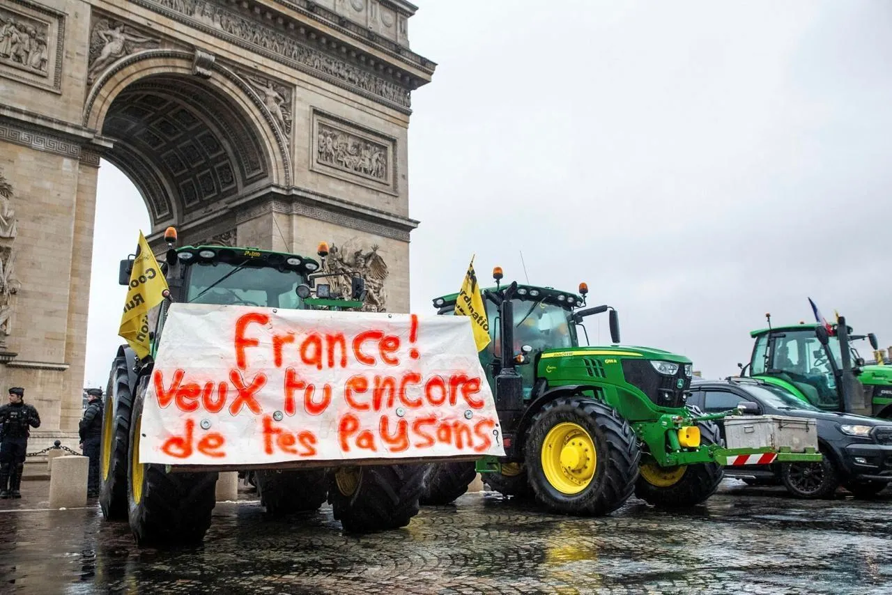 Paris, le 8 janvier 2026. La manifestation d’agriculteurs à l’appel du syndicat agricole français Coordination rurale au pied de l’Arc de Triomphe. © AFP