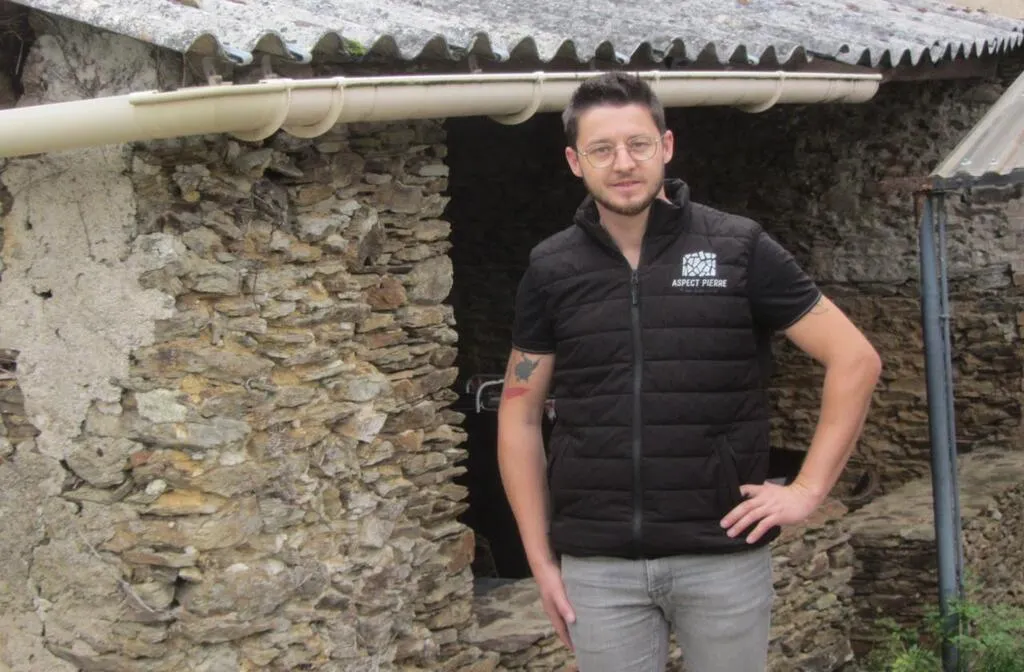 Axel Durand, paysagiste, est spécialisé dans la pierre de parement. Il est ici devant une de ses réalisations. © Ouest-France