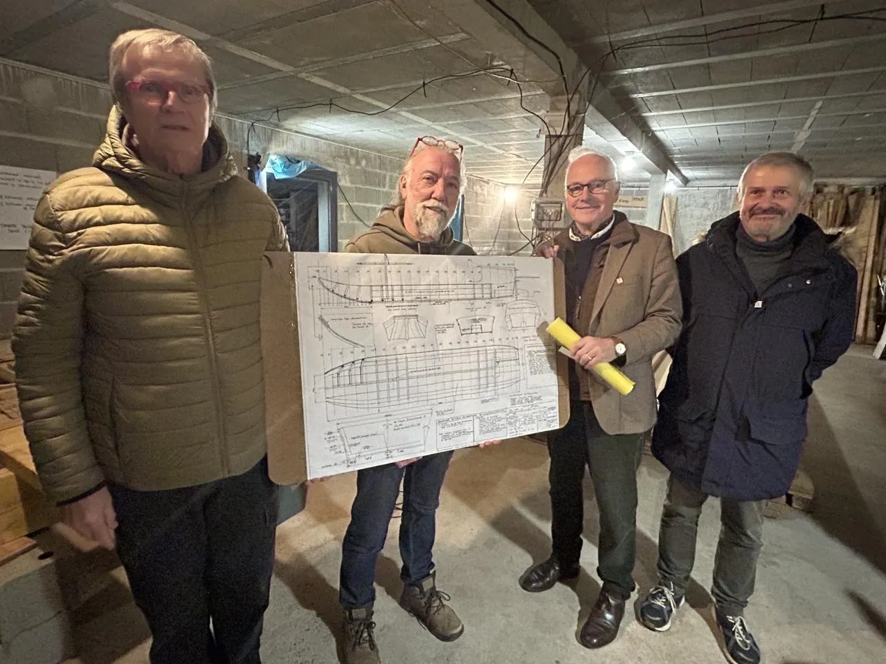Le président Demazières (à gauche) de l’association des Bateliers des Ponts reçoit l’aide de la Fondation du patrimoine pour financer la construction d’une toue sablière. © CO – Emmanuel Poiupard