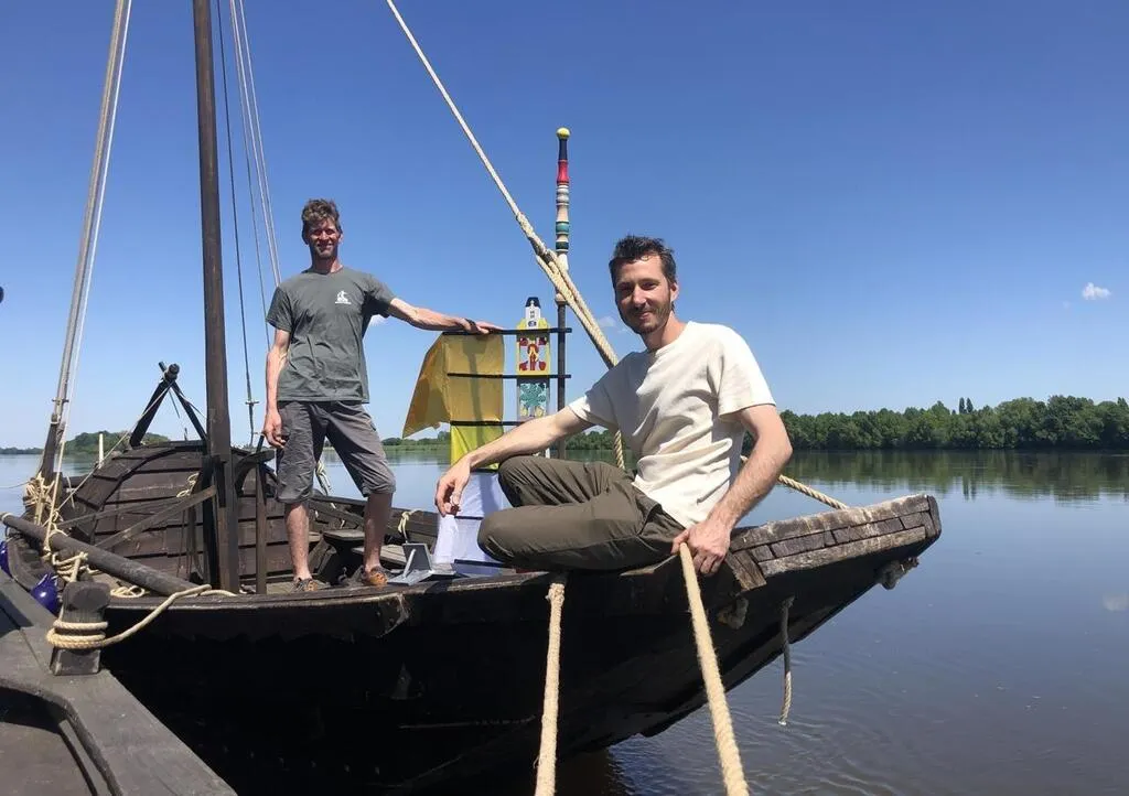 Benjamin Vandamme - avec le guirouet du bateau - et Vincent Racinet, membres de l’association Jeanne Camille du Thoureil. Pendant huit ans, avec les autres bénévoles, ils ont sauvé pas à pas Val de Vienne, l’un des plus beaux bateaux traditionnels de la Loire. © OUEST-FRANCE