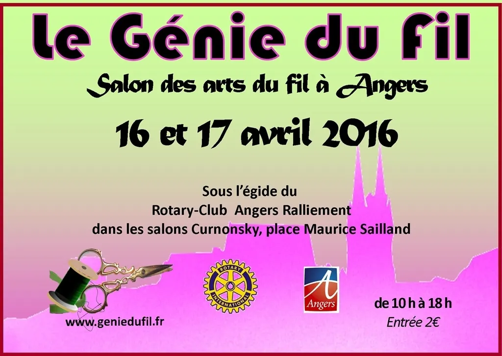 Pour son troisième salon, le Génie du fil est invité à Angers. Cet évènement autour du fil, réunissant exposants et créateurs aura lieu les 16 et 17 avril 2016 dans les prestigieux salons Curnonsky en centre ville et sous l’égide du Rotary Club d’Angers.