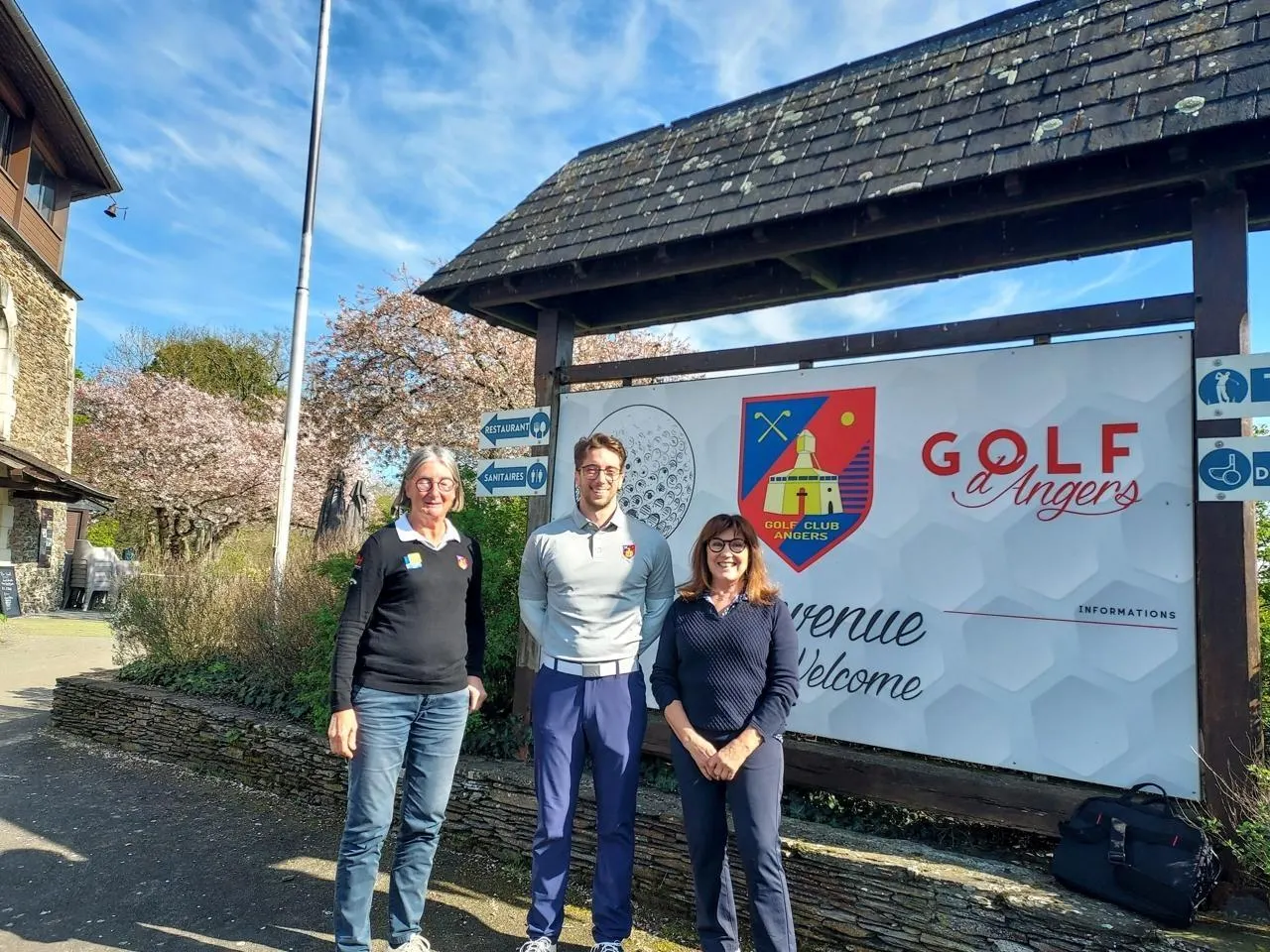 Jérémy Rocco, le nouveau directeur du golf d’Angers a pris ses fonctions depuis le 1er décembre 2025. Il pose ici entre Joëlle Zych, secrétaire dans le conseil d’administration de l’association et Pascale Deremaux, présidente. © Ouest-France