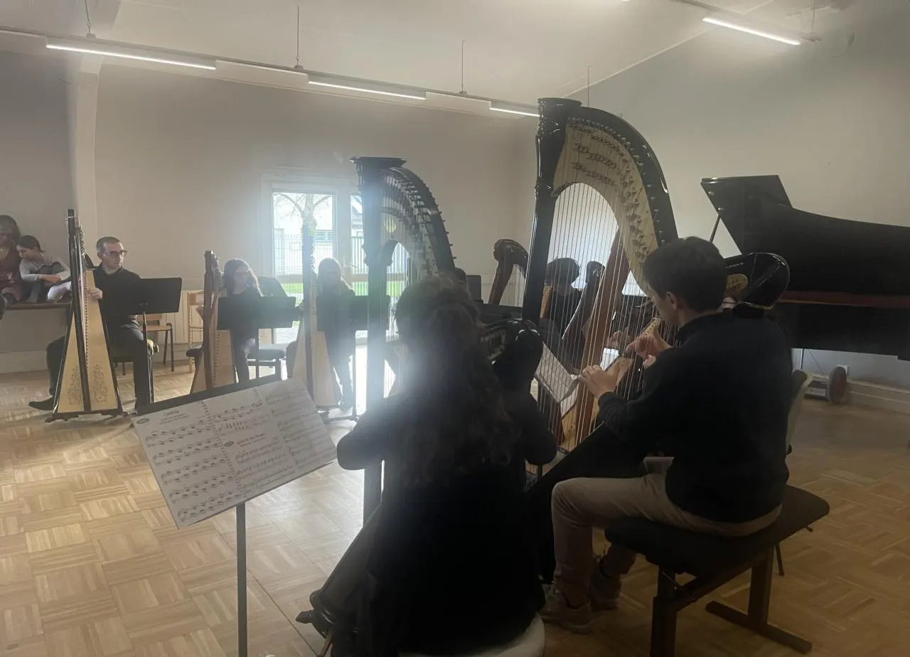 Le cycle 2 de la classe de harpe d’Isabelle Formet, professeure de harpe à l’école de musique de l’Anjou Bleu, en mini-concert. © Ouest-France.