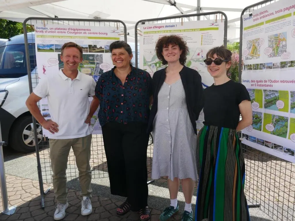 Arnaud Guedet, adjoint à l’urbanisme du Lion-d’Angers ; Gaëlle Pinier, de Map paysage, architecte paysagiste ; Solène Vialle, architecte urbaniste, et Laureline Guilpain, cheffe de projet à Ville ouverte, maître d’œuvre de l’étude. © Ouest-France