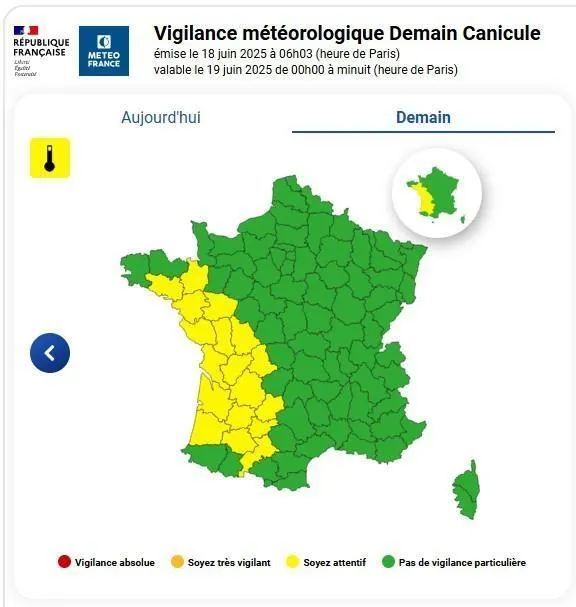 À partir de ce jeudi 19 juin 2025, le Maine-et-Loire se trouvera en vigilance jaune « canicule ». Les températures maximales en journée devraient dépasser 34 °C, d’après les prévisions de Météo France. La préfecture du département émet des recommandations.