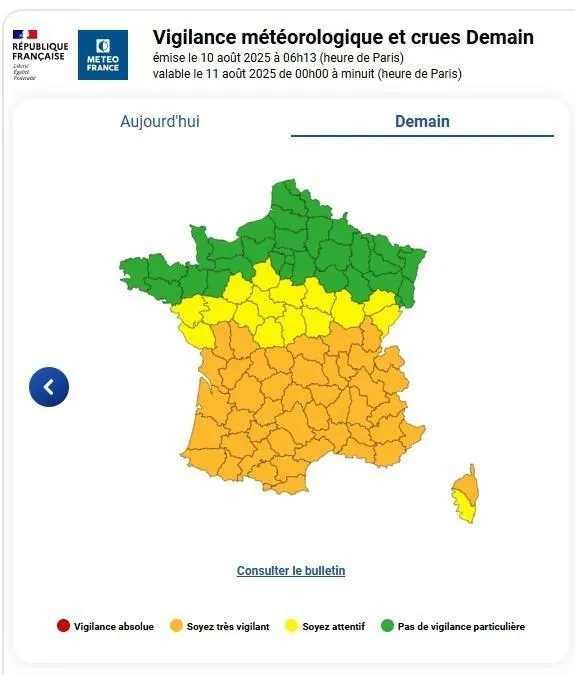 Le Maine-et-Loire sera en vigilance jaune canicule à partir de ce lundi 11 août 2025. Capture d’écran : Météo France
