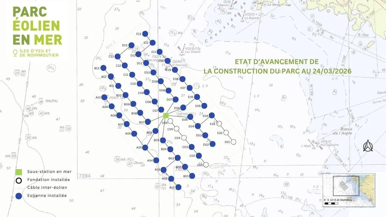 Il touche à sa fin : le parc éolien Yeu-Noirmoutier est presque terminé. Au 24 mars 2026, 54 éoliennes sur les 61 programmées étaient installées. Les quelques ...