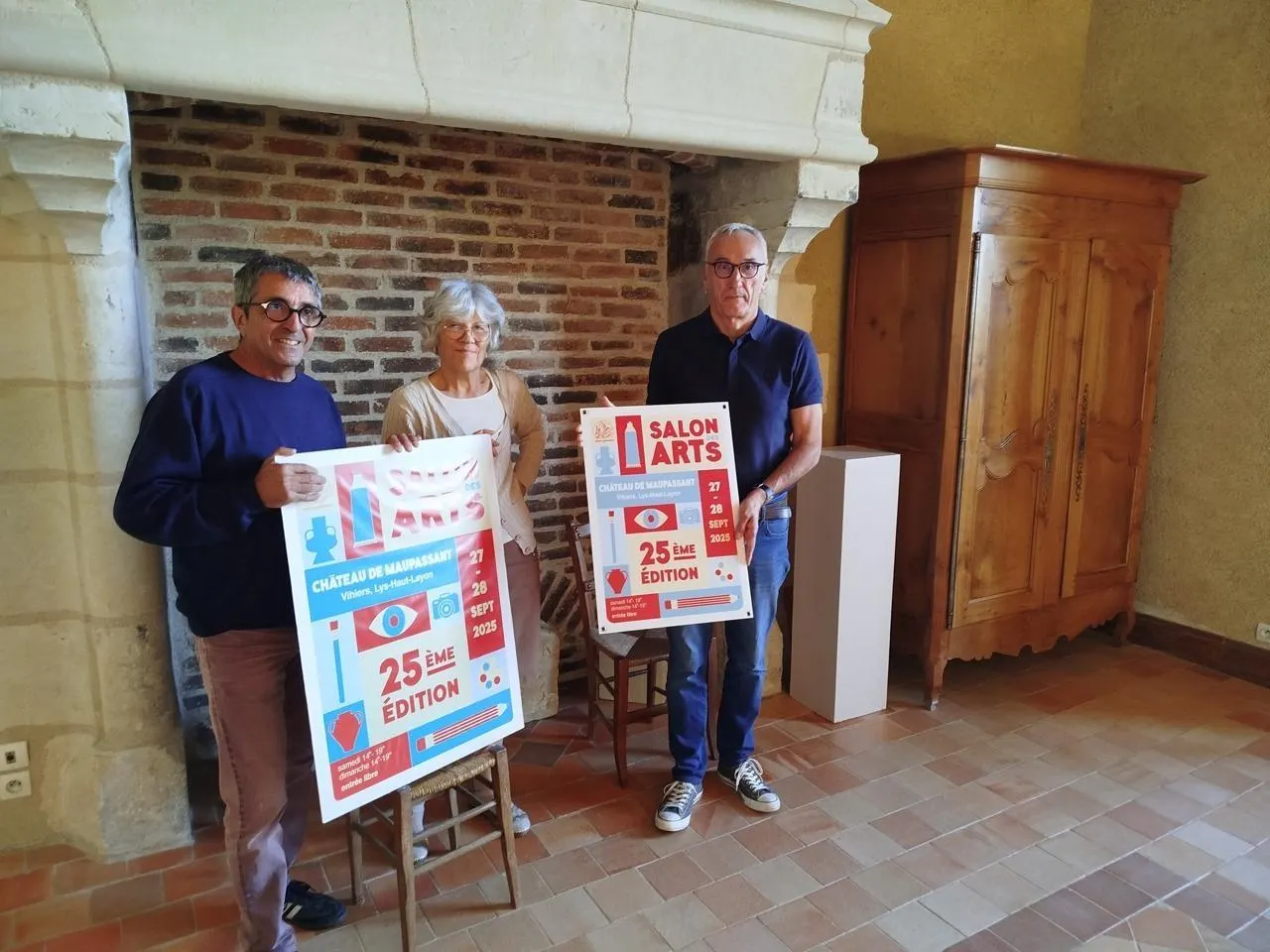 Le 25e salon des arts se tiendra du 27 au 28 septembre 2025 au château de Maupassant à Vihiers (Lys-Haut-Layon). La nouvelle équipe a concocté une édition très éclectique : de gauche à droite, Michel Brossier, Annie Chollet-Baumard, présidente de Vihiers patrimoine ; et Bernard Moreau. © Ouest-France