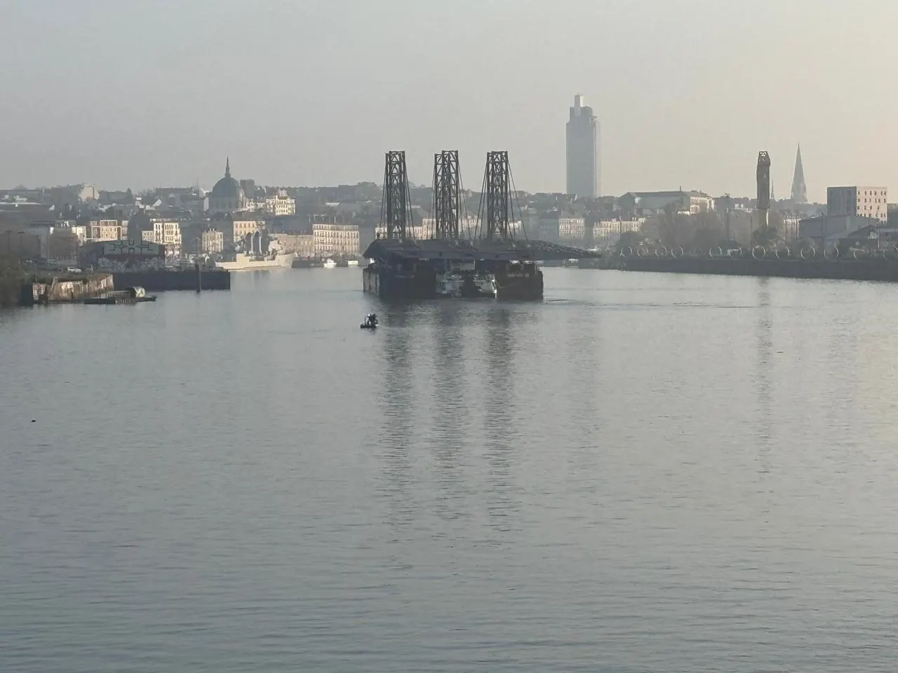 Le tablier vogue sur la Loire ce matin pour rejoindre sa destination finale, le pont Anne de Bretagne, à Nantes... |