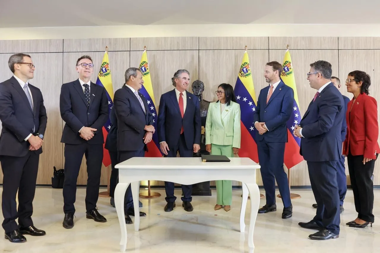 La présidente par intérim du Venezuela a rencontré le ministre de l’Intérieur des États-Unis, Doug Burgum, le 5 mars 2026 à Caracas. © Daniela MILLAN / AFP PHOTO / VENEZUELAN PRESIDENCY