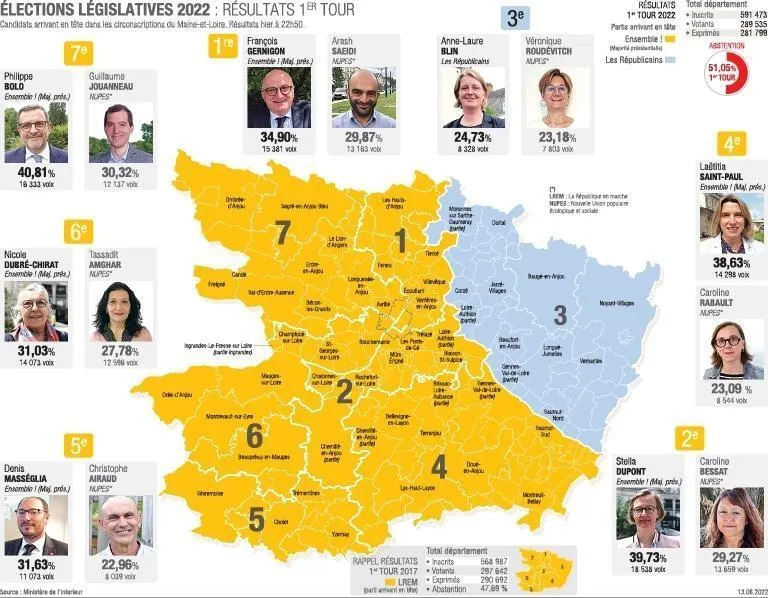 - La députée sortante Nicole Dubré-Chirat (Ensemble !) arrive en tête du 1er tour à Angers-Mauges (6e circonscription) avec 31,03%. Elle sera opposée au second tour à Tassadit Amghar (LFI) (NUPES) (27,78%)