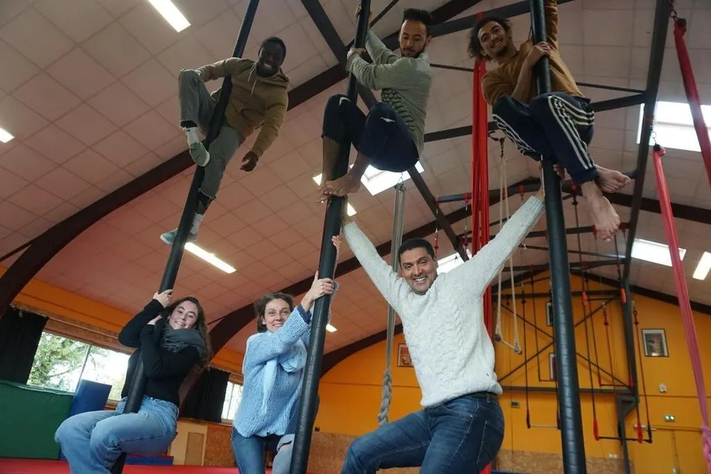 Khalid Lammini, le directeur de la Carrière avec l’équipe des cinq artistes permanents qui enseignent leurs arts du cirque et créent des spectacles. La réputation d’excellence de l’école a déjà enthousiasmé les spectateurs du festival des Accroche-cÅ“urs, par exemple. © La Carrière