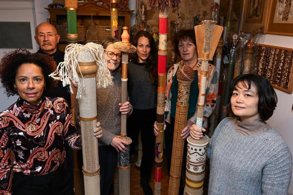 Angers, le 18 novembre 2024. Jean-Denis Maysonnave, Carole Nicolas, Béatrice Corfmat-Moulun, son invitée Élise Rochard, Anne Lepont et Miki Nakamura, ici au milieu des Tuballures, sont quelques-uns des artistes qui ouvrent ce week-end leur atelier. © CO – Laurent COMBET